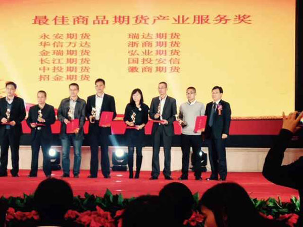 2015年11月13日,在由《證券時(shí)報(bào)》、《期貨日報(bào)》聯(lián)合主辦的“第八屆中國最佳期貨經(jīng)營機(jī)構(gòu)暨最佳期貨分析師評選”中,招金期貨榮獲“中國最具成長性期貨公司”、“最佳資產(chǎn)管理業(yè)務(wù)獎”、“最佳商品期貨產(chǎn)業(yè)服務(wù)獎”、“中國期貨優(yōu)秀營業(yè)部-招金期貨有限公司臨沂營業(yè)部”稱號,同時(shí)招金期貨分析師李曉杰、袁帥榮獲“最佳工業(yè)品期貨分析師”,這是業(yè)界對招金期貨近幾年快速發(fā)展的高度褒獎。 據(jù)悉,"中國最佳期貨經(jīng)營機(jī)構(gòu)暨最佳期貨分析師評選"已成功舉辦八屆,是國內(nèi)設(shè)立最早、行業(yè)中最權(quán)威和最具影響力的評選活動.