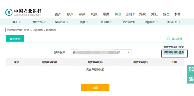 點(diǎn)擊“簽約管理”,選擇“銀期轉(zhuǎn)賬自助簽約”。